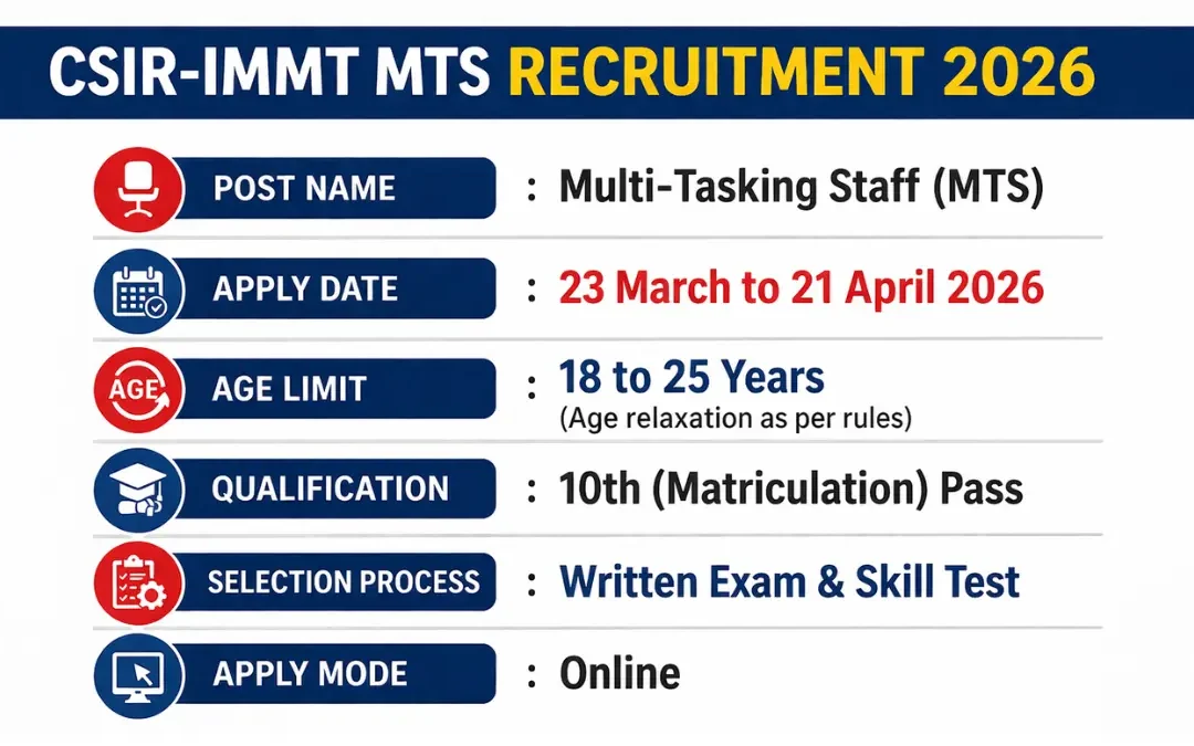 CSIR-IMMT MTS Recruitment 2026: CSIR-IMMT MTS Recruitment 2026 notification has been released for Multi-Tasking Staff (MTS) posts. Candidates who have passed 10th (Matriculation) from a recognized board are eligible to apply for these vacancies. The online application process will begin from 23 March 2026 and will continue till 21 April 2026.