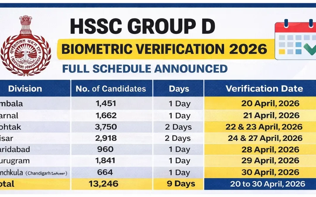 HSSC Group D Biometric Verification 2026: The Haryana Government has officially released the schedule for biometric verification of selected candidates for Group-D posts against Advertisement No. 01/2023. The verification process will be conducted from 20 April to 30 April 2026 at the divisional level across the state. A total of 13,246 candidates will undergo biometric verification in different divisions including Ambala, Karnal, Rohtak, Hisar, and others. Candidates must report on their assigned dates to avoid disqualification. The process will be supervised by Divisional Commissioners and the Deputy Commissioner, Panchkula. This step is mandatory for final selection and appointment.