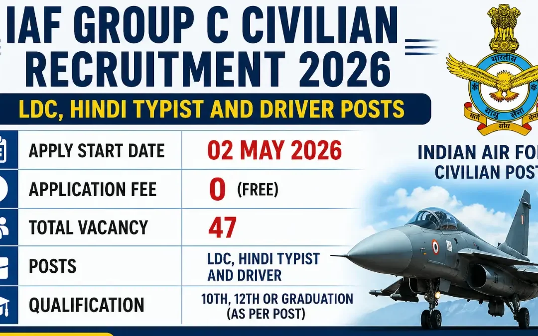 IAF Group C Civilian Posts Recruitment 2026: IAF Group C Civilian Recruitment 2026 has been announced for various posts including LDC, Hindi Typist, and Driver with a total of 47 vacancies. The application process will start from 02 May 2026, and candidates can apply as per the prescribed offline/online mode mentioned in the notification.