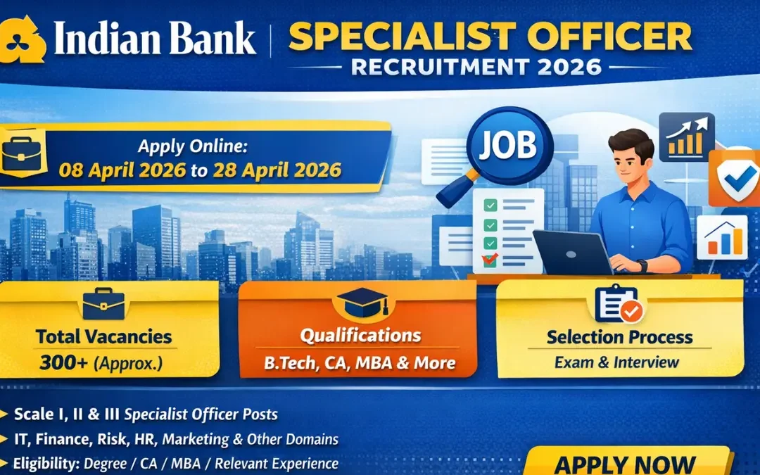 Indian Bank SO Recruitment 2026: Indian Bank has released the official notification for the recruitment of Specialist Officers (SO) for various Scale I, II, and III posts. This recruitment drive offers excellent opportunities for candidates in IT, Finance, Risk, Marketing, HR, and other specialized fields across India. Interested and eligible candidates can apply online through the official portal.