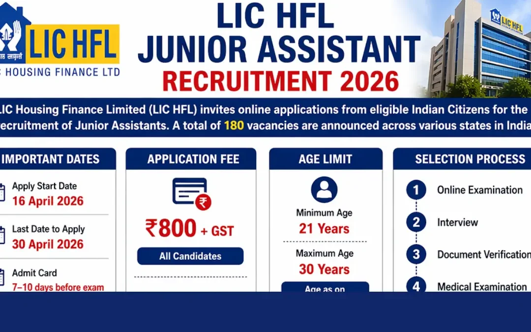 LIC HFL Junior Assistant Recruitment 2026: LIC Housing Finance Limited (LIC HFL) has released an official notification for the recruitment of Junior Assistant posts. A total of 180 vacancies have been announced across various states in India. The online application process has started from 16 April 2026 and will continue till 30 April 2026. Interested and eligible candidates can apply online through the official website of LIC HFL.