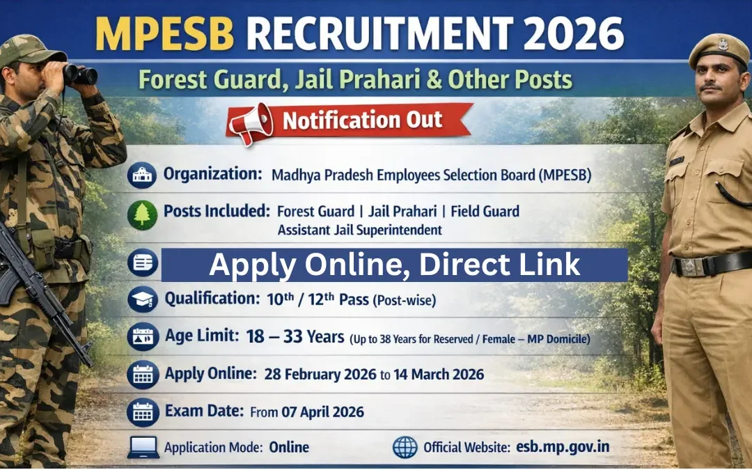 MPESB Recruitment 2026: The Madhya Pradesh Employees Selection Board (MPESB) has released the official notification for MPESB Recruitment 2026 for direct recruitment to various executive posts under the Forest Department and Jail Department of Madhya Pradesh. The recruitment examination will be conducted for Forest Guard (Van Rakshak), Field Guard (Kshetra Rakshak), Jail Prahari, and Assistant Jail Superintendent posts.