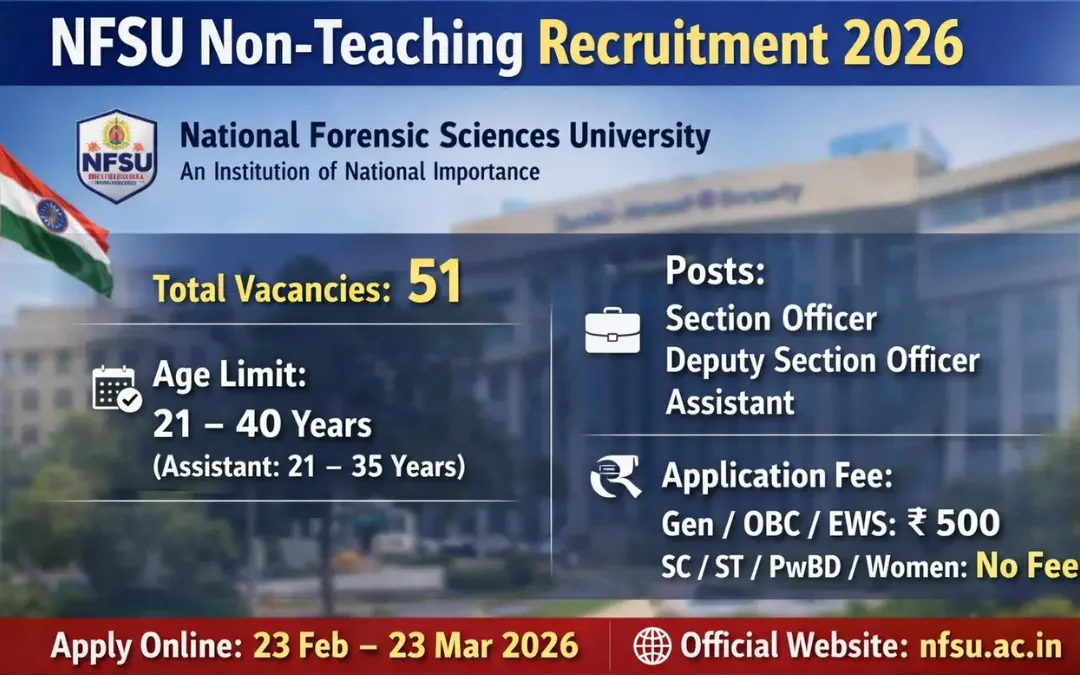 NFSU Non-Teaching Recruitment 2026: National Forensic Sciences University (NFSU), an Institution of National Importance under the Ministry of Home Affairs, has released an official notification for Non-Teaching (Non-Academic) Recruitment 2026. The recruitment advertisement number is NFSU/NON-ACADEMIC/02/2026, dated 23 February 2026.