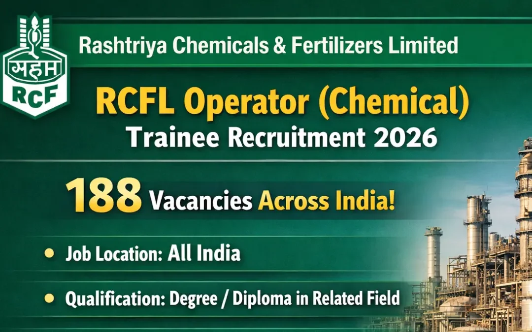 RCFL Operator Trainee Recruitment 2026: Rashtriya Chemicals and Fertilizers Limited has released the Operator (Chemical) Trainee Recruitment 2026 notification for 188 vacancies across India. The online application process will start from 11 April 2026 and will continue till 27 April 2026.