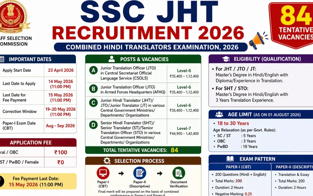 SSC JHT Recruitment 2026: The SSC JHT Recruitment 2026 notification has been officially released for 84 tentative vacancies of Junior Hindi Translator, Senior Hindi Translator, and other posts. This recruitment is conducted by the Staff Selection Commission for various Ministries/Departments of the Government of India. The online application process has started from 23 April 2026 and candidates can apply till 14 May 2026.