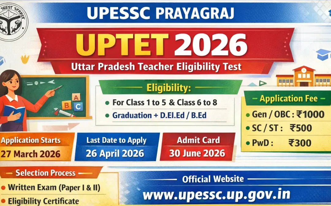 UPTET 2026 Notification: The Uttar Pradesh Education Service Selection Commission has released the official notification for UPTET 2026 through Advertisement No. 01/UPTET/2026. This exam is conducted for candidates who want to become teachers for Classes 1 to 8 in Uttar Pradesh schools.
